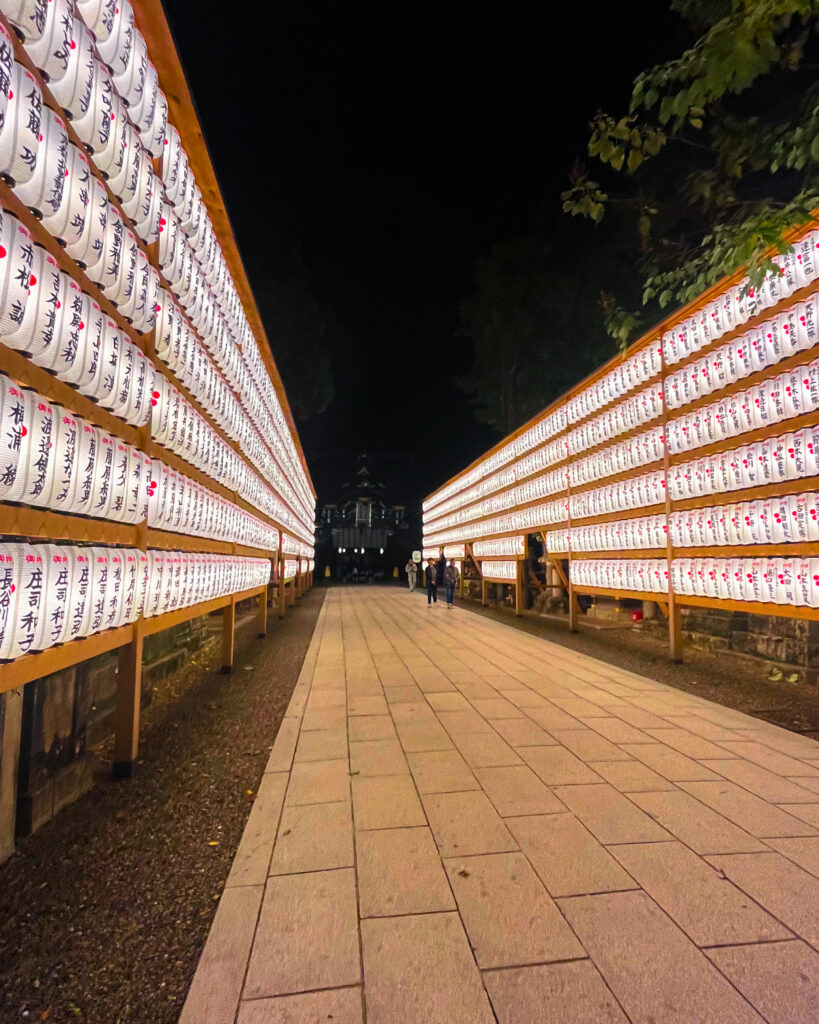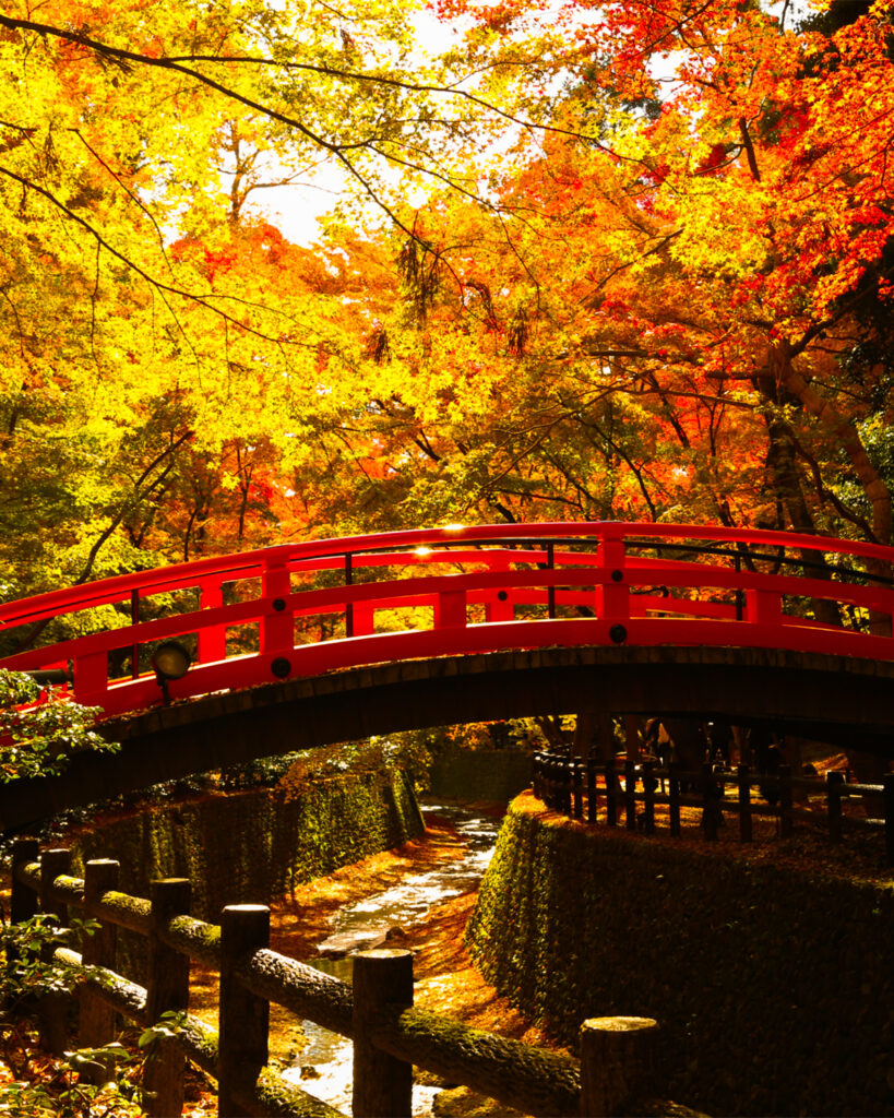 「御土居」の構造をそのまま活かした苑内では、上部からもみじを見下ろす景観、下部から見上げる紅葉の眺めをそれぞれ楽しめます。約350本の紅葉が、朱塗りの「鶯橋」や展望所、国宝の本殿を背景に彩りを添え、昼とはまた異なる幻想的なライトアップ空間が広がります。