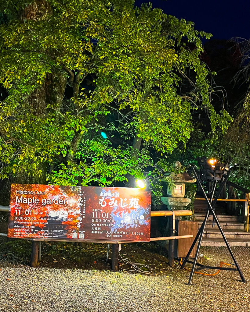 Within the garden, you can enjoy views of maple trees from above (on the upper earthwork) and also from below, creating a unique autumn scenery. The site features approximately 350 maple trees, the vermilion‐painted “Uguisubashi” bridge, a viewing platform overlooking the national treasure main hall, and the historic Ōdoi earthen rampart constructed in the Momoyama period — all enveloped in the glowing light of evening.